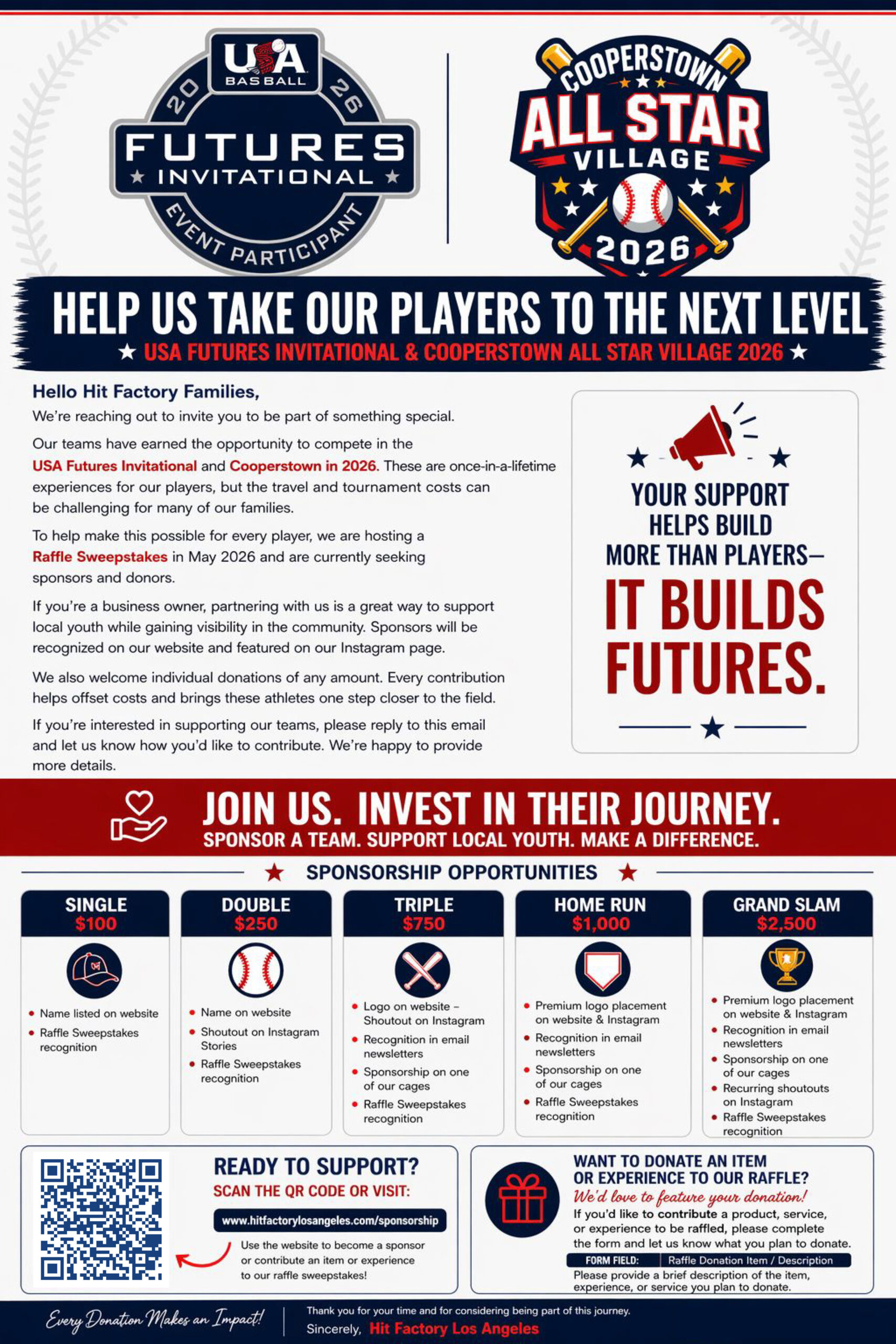 Thank you for supporting our athletes on their journey to the USA Futures Invitational and Cooperstown 2026. This form allows you to become a sponsor or contribute an item/service to our May 2026 Raffle Sweepstakes. Every contribution helps make this opportunity possible for our players.